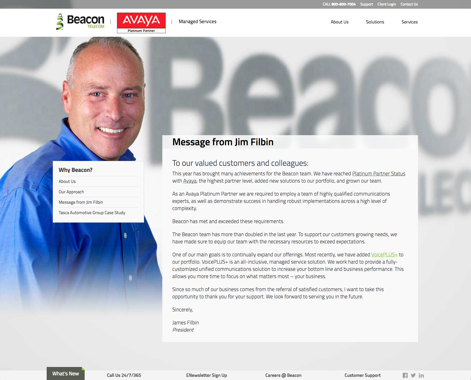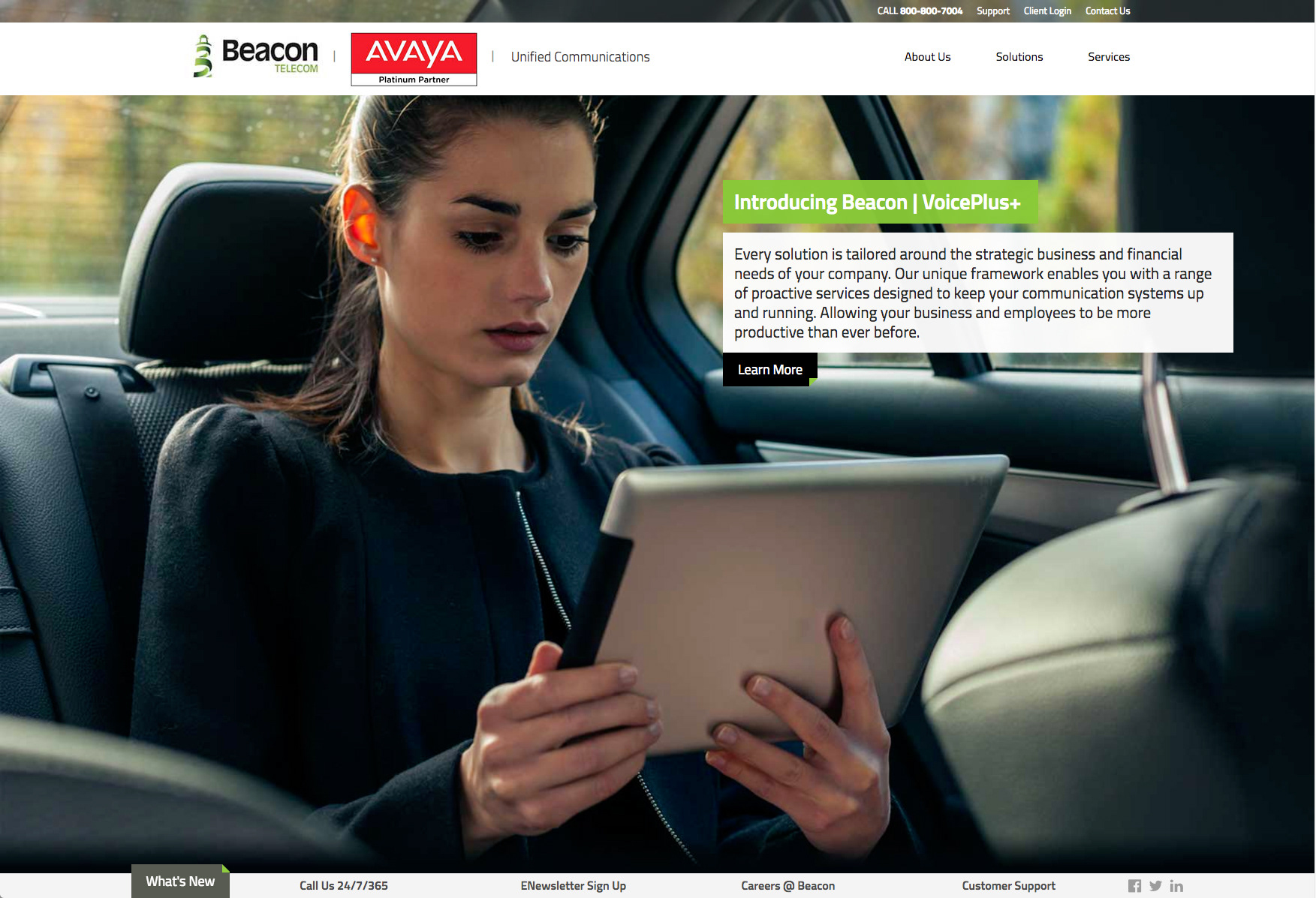 Beacon Telecom, a Platinum Avaya Business Partner, approached us to design their website with the goal of presenting their innovation and dedication to customer service. We chose parallax scrolling on the home page for its wow factor and created a slide-out panel for news and events updates. Full screen backgrounds on all responsive viewports adds life to a technical subject and the integration of case studies highlights valuable content.