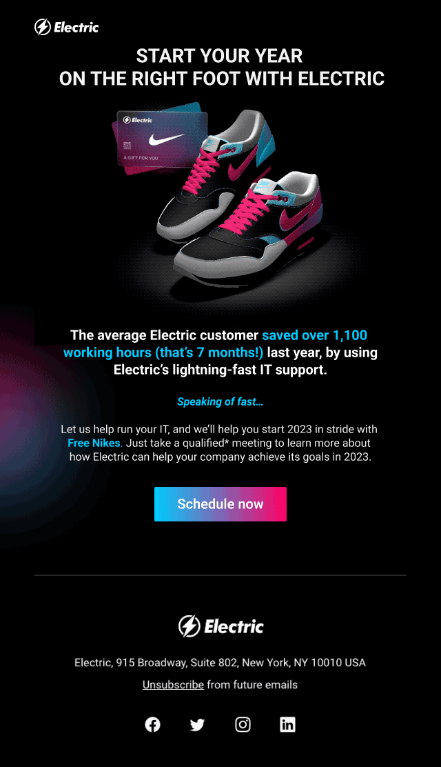 With the modules and workflows in place, the last part of the project was to polish the emails with animation and personalization. The following is an example of a direct email promotion offering a Nike gift card in exchange for a demo. I 3d modeled the image and reduced the frame count of the gif to keep the email file size low, avoiding spam filters and deliverability issues.