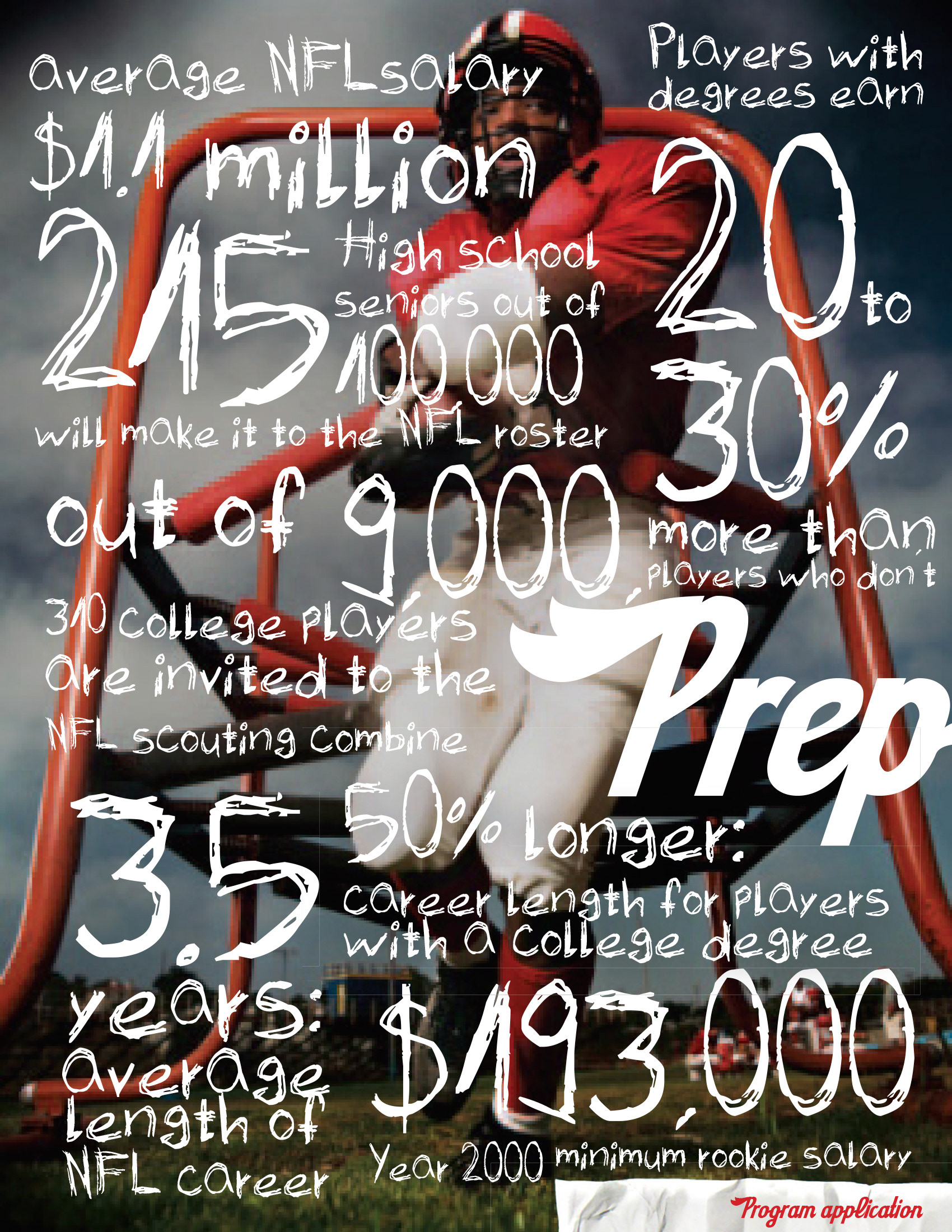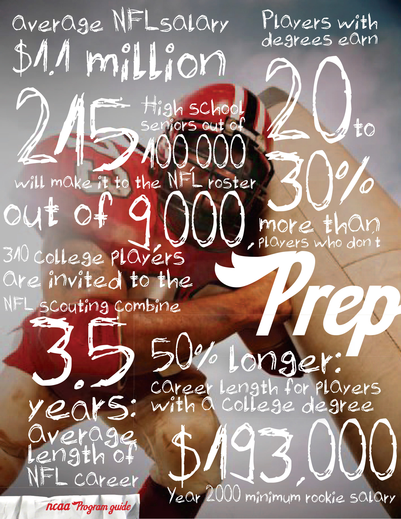 The NFL needed concepts for a series of guide covers that would appeal to 3 separate audiences: NFL hopeful high school students, NFL players, and retiring NFL players. The goal was to create distinct styles yet maintain continuity with a similar visual language. Statistics tailored to each audience presented with large typography over striking visuals allowed the flavor of each piece to come through.